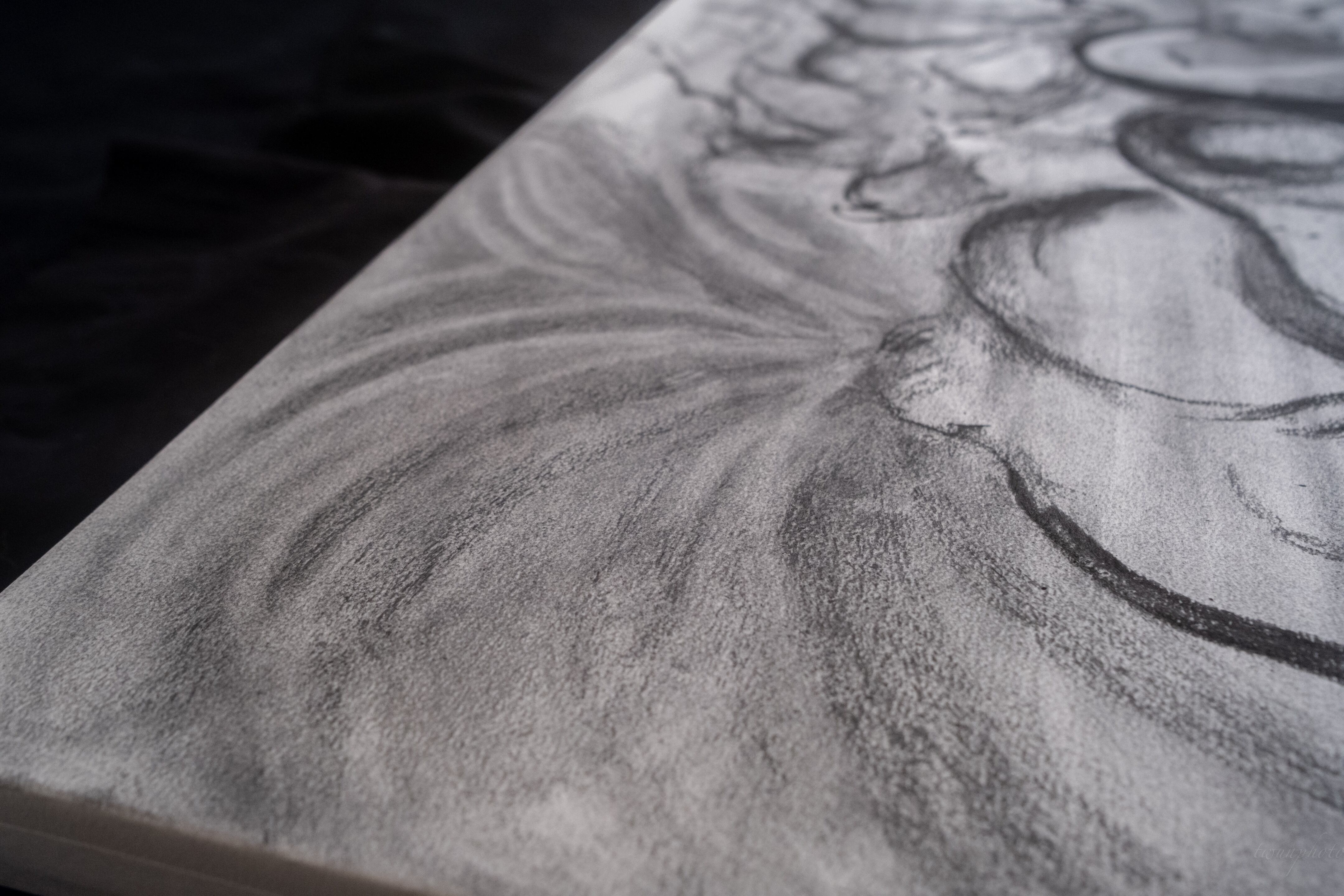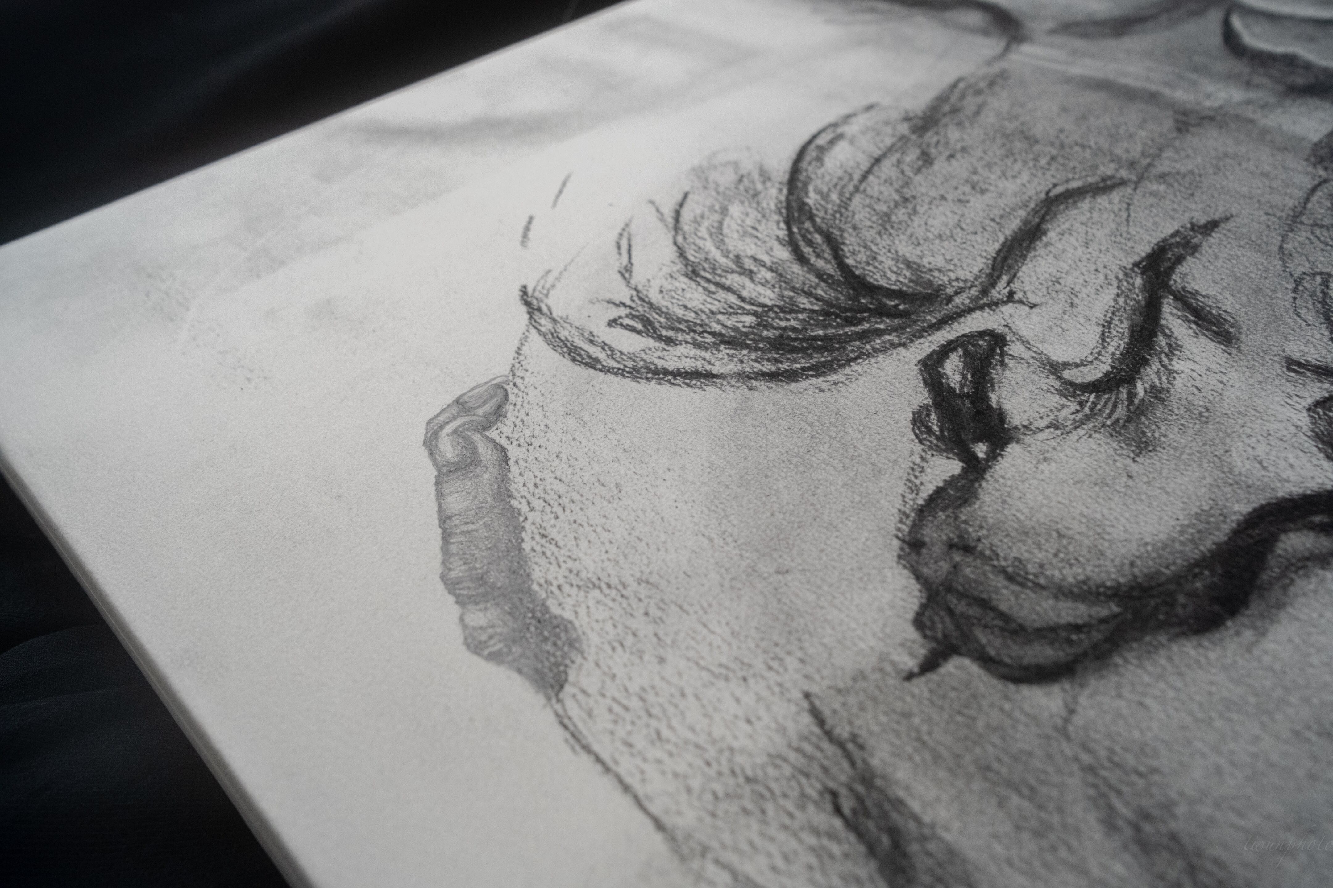 B2サイズの画用紙に、木炭と鉛筆を駆使し、繊細かつ迫力ある表現を追求して仕上げました。
