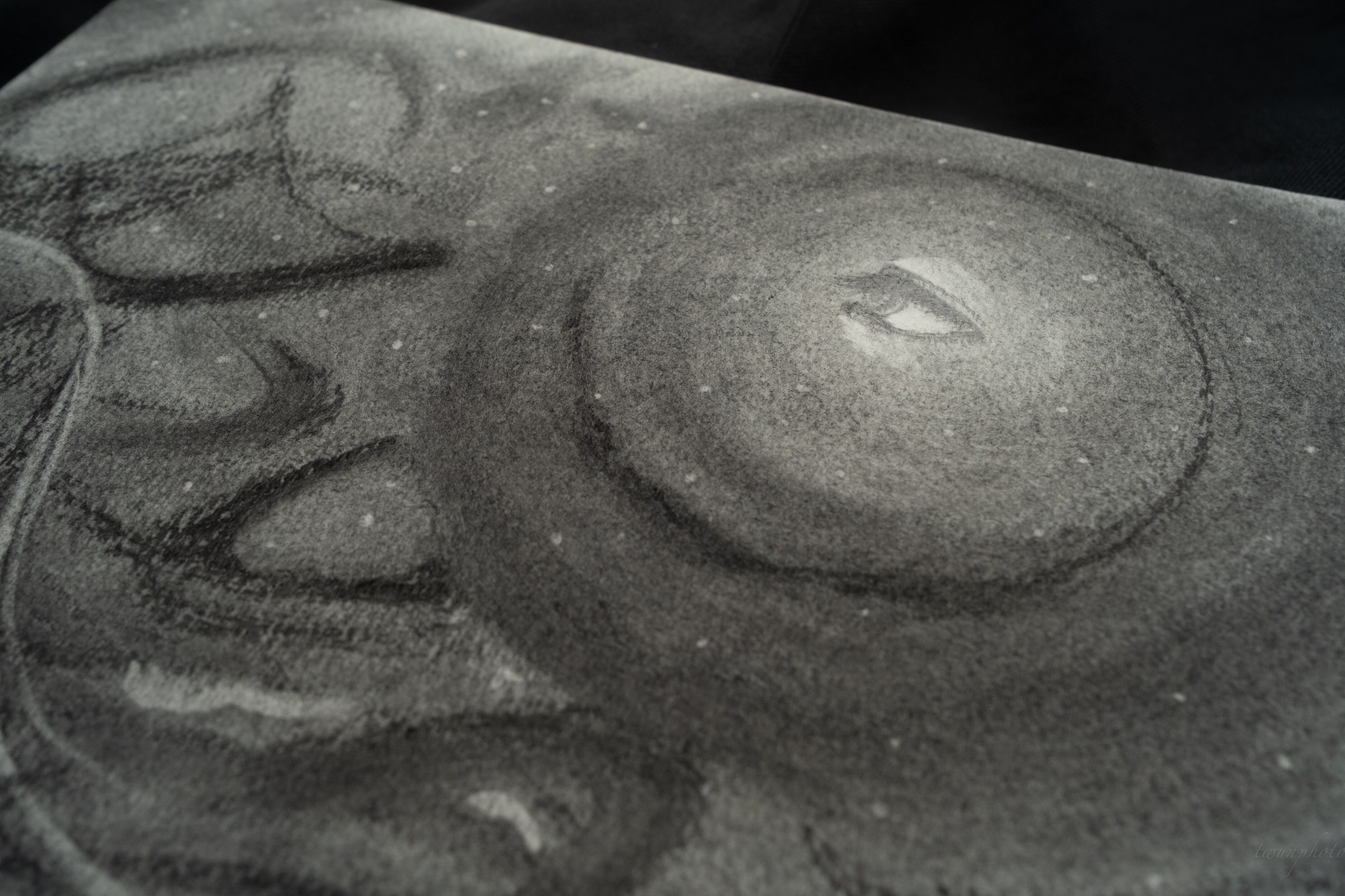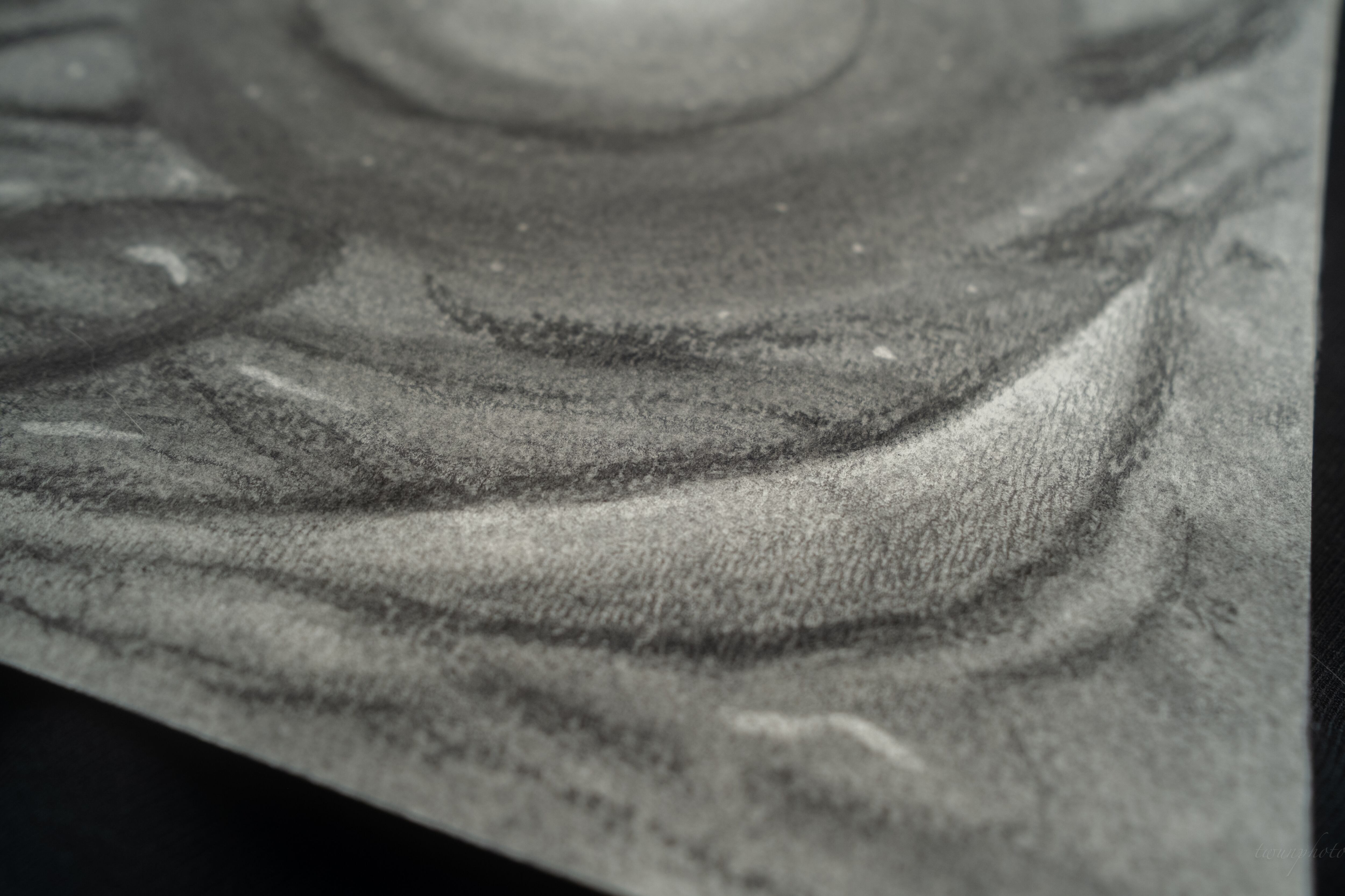 A4サイズの画用紙に、木炭と鉛筆を駆使し、独自の世界観を表現しています。すっきりとしたサイズ感は、あらゆる空間で魅力を放つことでしょう。フィキサチーフ処理済みで、作品の美しさを長くお楽しみいただけるよう工夫されています。